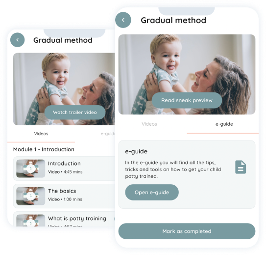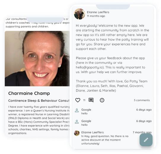 Parents potty train their child (around 18 months) at home with support from the Go Potty® app. Nursery staff and other healthcare staff get the right skills and knowedledge to support children with potty training via a succinct Go Potty® e-learning.