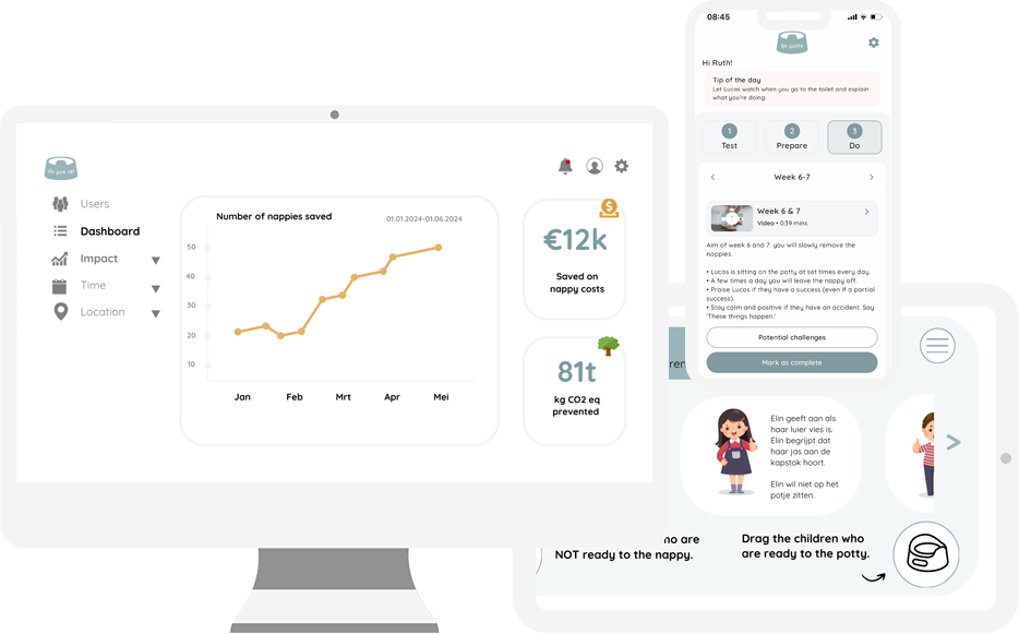 Besides that, we offer a uniquely designed portal where managers from nurseries and municipalities can monitor 24/7 the progress of the Go Potty® program (including potty training success, nappy and CO2 savings).