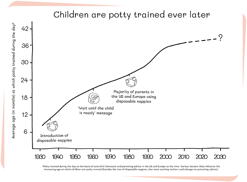 Children are being potty trained ever later. In the 1940s, most children were potty trained at around 12 months. Now, they are 3 years old on average. This negatively affects the environment and children’s health. At the same time many parents struggle with potty training. They are unsure whether their child is ready or how to best train their child. Often this leads to delayed potty training.